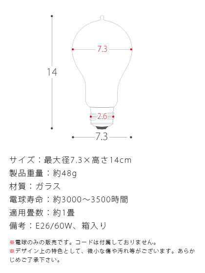 最大径7.3×高さ14cm 製品重量:約48g 材質:ガラス 電球寿命:約3000〜3500時間 適用畳数:約1畳 備考:E26/60W、箱入り ※電球のみの販売です。