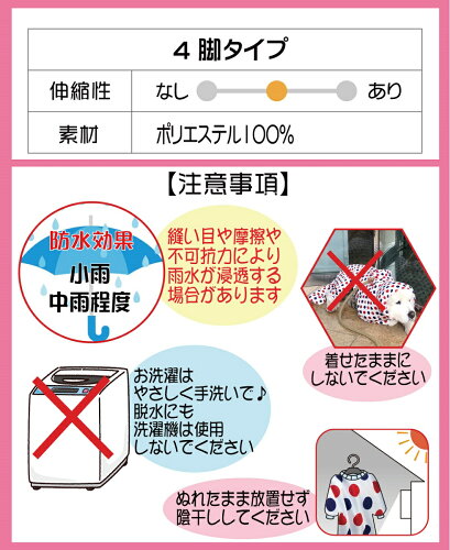 商品名 ストレッチフルカバーレインコート 4脚タイプ 6号・7号【ネコポス不可】 素材 ポリエステル100% 耐水度2300mm 透湿性230g/m2・h 試験済/中雨程度の防水対応 配送方法 「佐川急便」 注意事項 ※縫い目や摩擦や不可抗力により雨水が浸透する場合があります ※洗濯はやさしく手洗いしてください ※無蛍光洗剤をご使用ください ※洗濯機で脱水しないでください ※濡れたまま放置せず陰干ししてください ※湿気を避け、乾燥状態で保管してください ※濡れたままや汚れたまま保管すると劣化を早めます ※長く使用すると防水・透湿効果が減少します ※火の近くや高温の場所では使用しないでください ※着せたままにしないでください ※お散歩や遊んでいる時、生地の破損にご注意ください ※ゴム・ストッパーなどを飲み込まないよう、飼い主様の管理の元でご使用ください ※万が一飲み込んだ時は獣医師の診断を受けてください カテゴリキーワード [C:柴犬レインコート]VERYでは他にもドッグウェアを豊富に取り揃えています♪