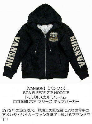【5サイズ】nb291 新品 VANSON トリプルスカル フレイム ロゴ刺繍 ボアフリース ジップパーカー NVSZ-910 メンズ バンソン BOA FLEECE ZIP HOODIE フード フリースジャケット 【smtb-kd】